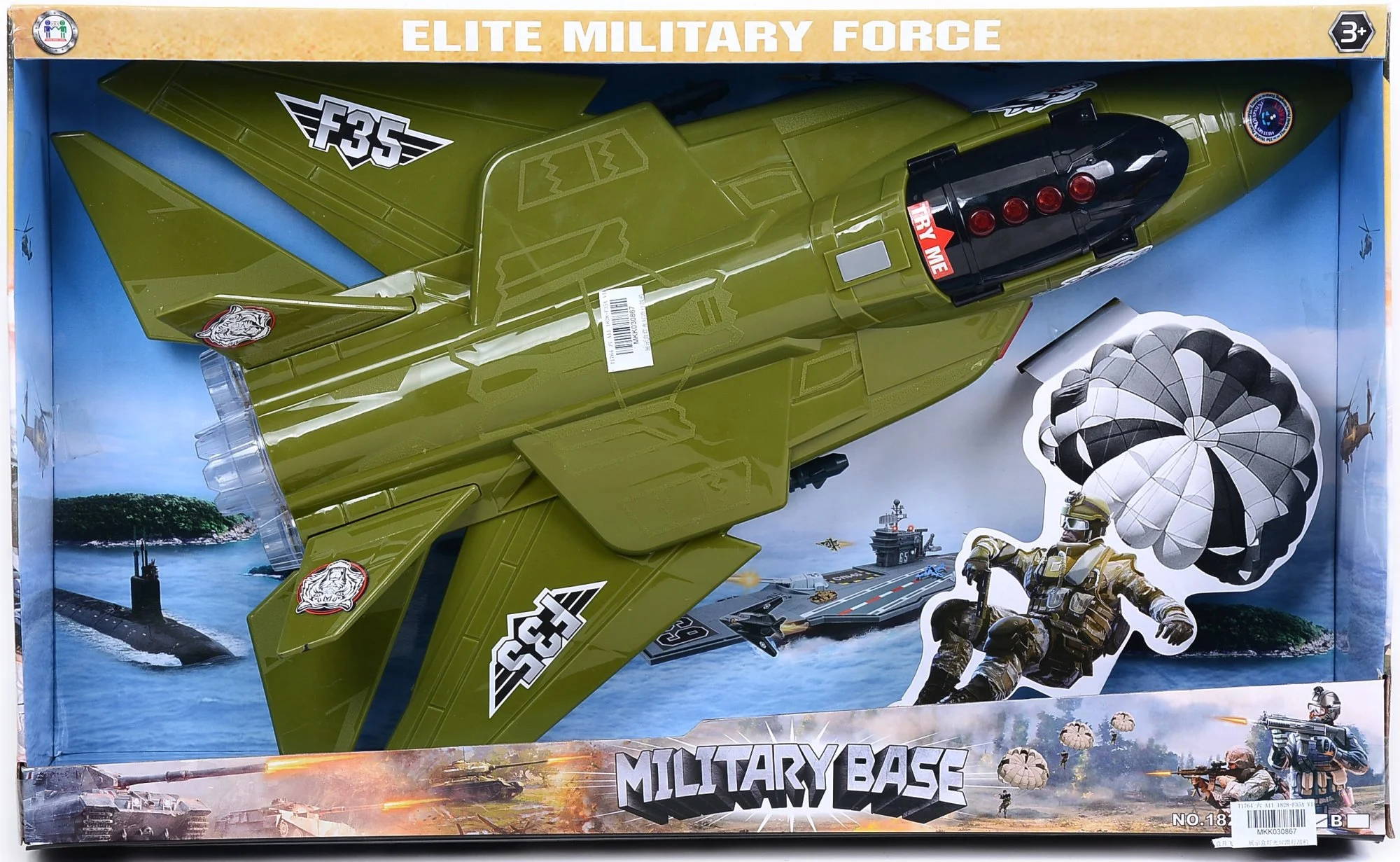 Αεροπλάνο με Φως Military Base. Πολεμικό αεροσκάφος με φως και ήχους μάχης! Περιλαμβάνονται 1 στρατιώτης και εξοπλισμός. *Λειτουργεί με 3 μπαταρίες ΑΑ (περιλαμβάνονται)