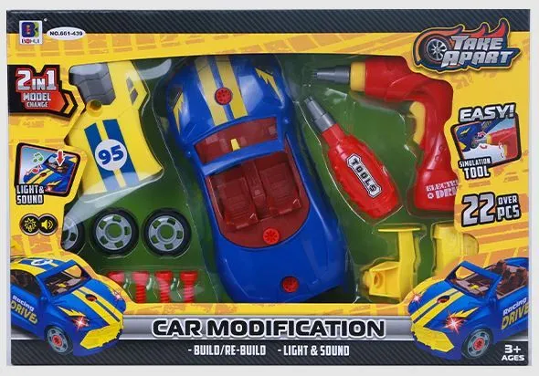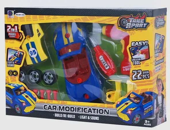 Αυτοκίνητο Αγώνων 2 σε 1 Με Φως και Ήχους Μετασχηματιζόμενο αυτοκίνητο για συναρμολόγηση ή αποσυναρμολόγηση σε 22 τεμ. Συνοδεύεται από κατσαβίδι, μπουλόνια και άλλα αξεσουάρ. – Συμπεριλαμβάνονται 2 μπαταρίες AG13 (αυτοκίνητο) – 2 μπαταρίες AA δεν περιλαμβάνονται (τρυπάνι).