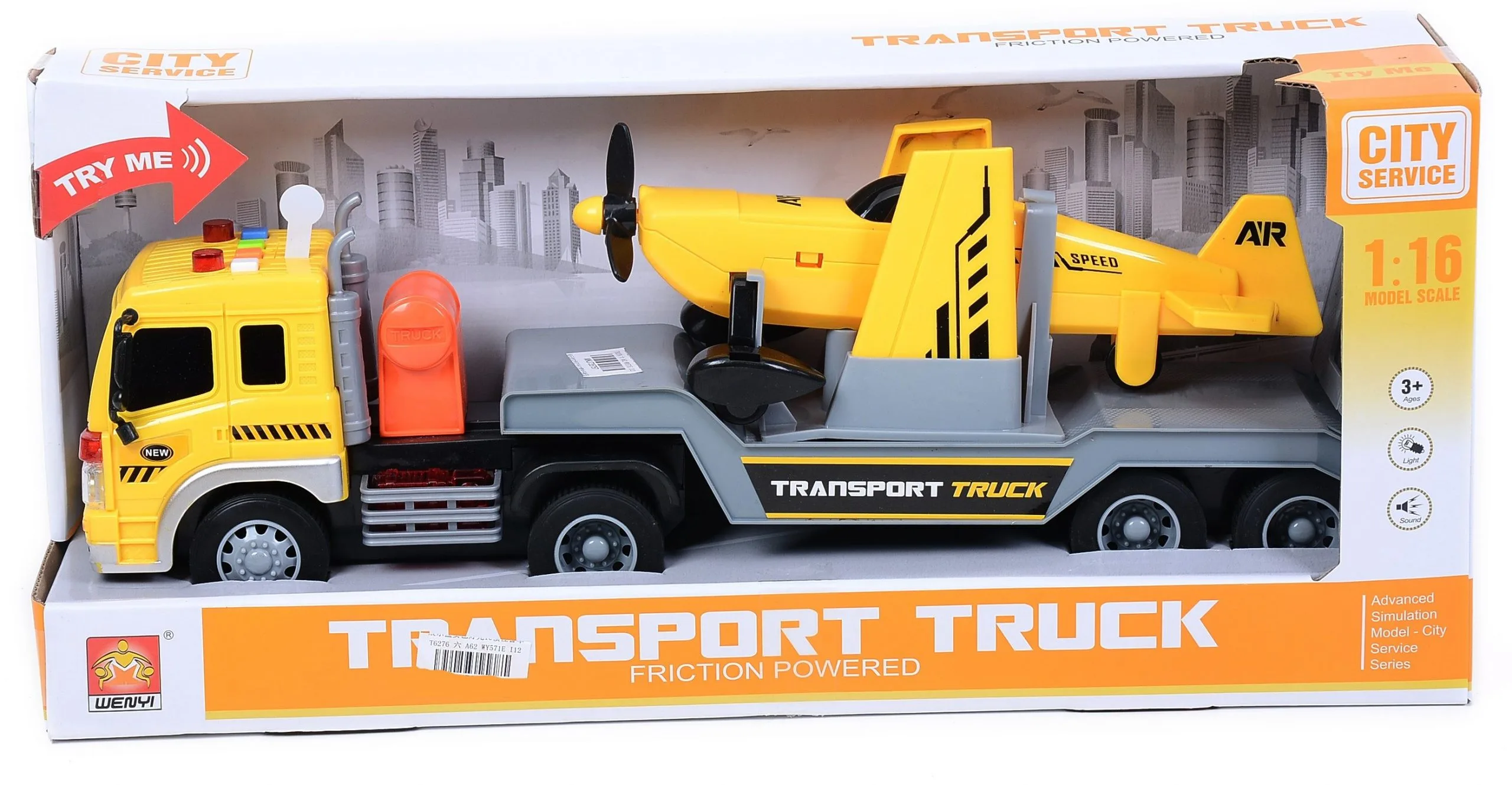 Φορτηγό Με Τρέιλερ Και Αεροπλάνο Όταν πατηθούν τα κουμπιά, το φορτηγό κάνει θόρυβο και ανάβει. Διαστάσεις φορτηγού περίπου 40 x 11 x 8 cm. Περιλαμβάνει μπαταρίες Λειτουργεί με 3 μπαταρίες LR44 (περιλαμβάνονται)