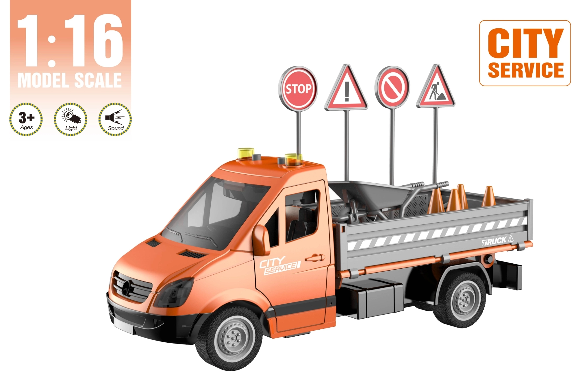 Μπαταριοκίνητο Φορτηγό Με Σήματα Οδικής Κυκλοφορίας Φορτηγό της σειράς City Service για την συντήρηση -έργα στοςυ δρόμους Με πόρτες που ανοίγουν, φώς και ήχο