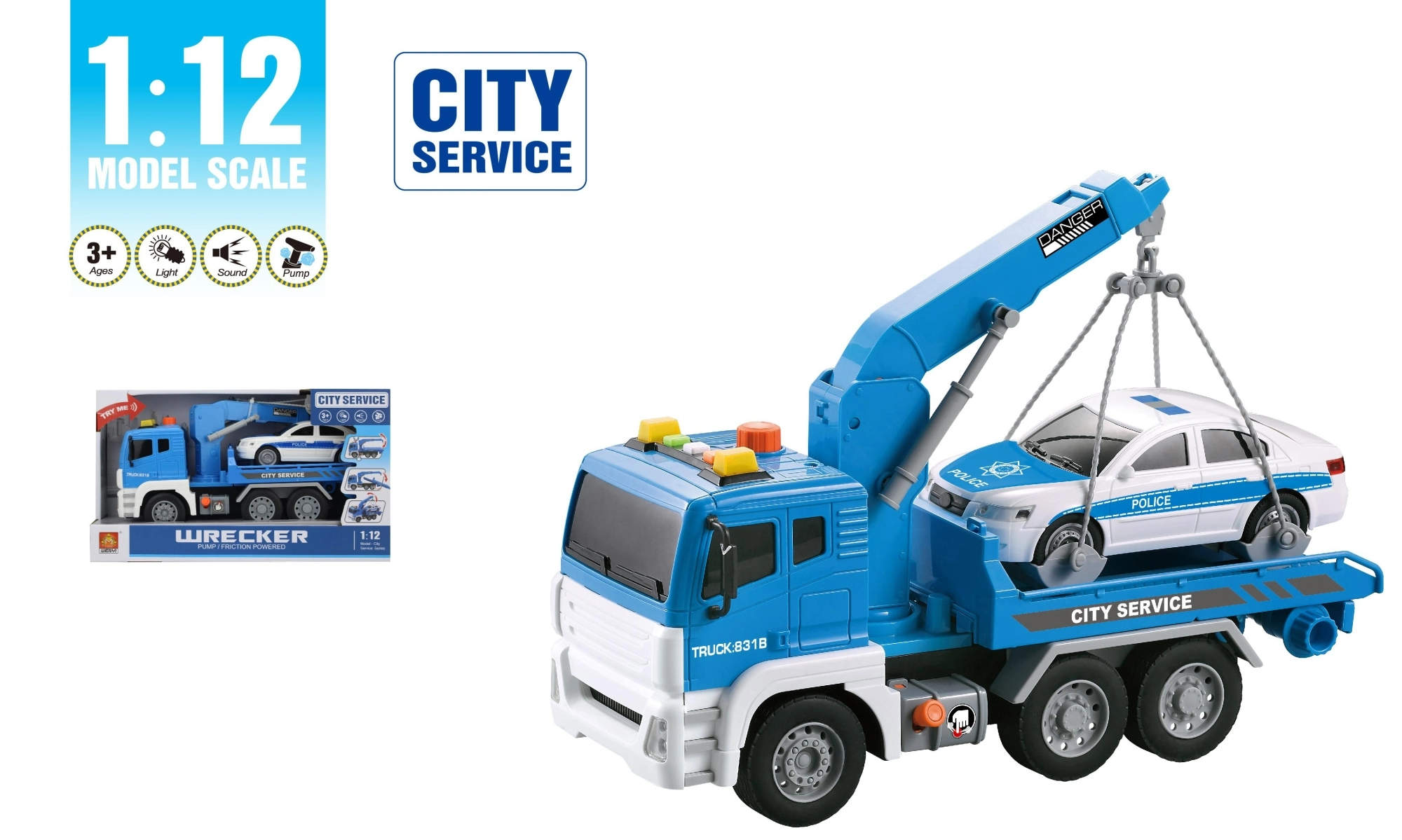 Μπαταριοκίνητο Όχημα Με Γερανό Και Αυτοκίνητο Μπαταριοκίνητος γερανός και περιπολικό Με λειτουργία ανύψωσης του γερανού, κινούμενη ράμπα Με φώς και ήχους Κλίμακα: 1:12