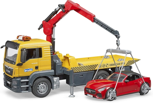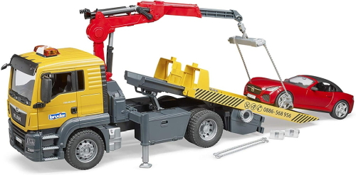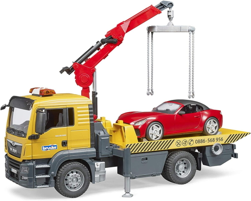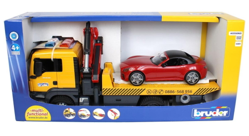 Bruder Φορτηγό MAN Οδικής Βοήθειας με Αγωνιστικό Αυτοκίνητο. Φορτηγό MAN οδικής βοήθειας με γερανό και αυτοκίνητο.