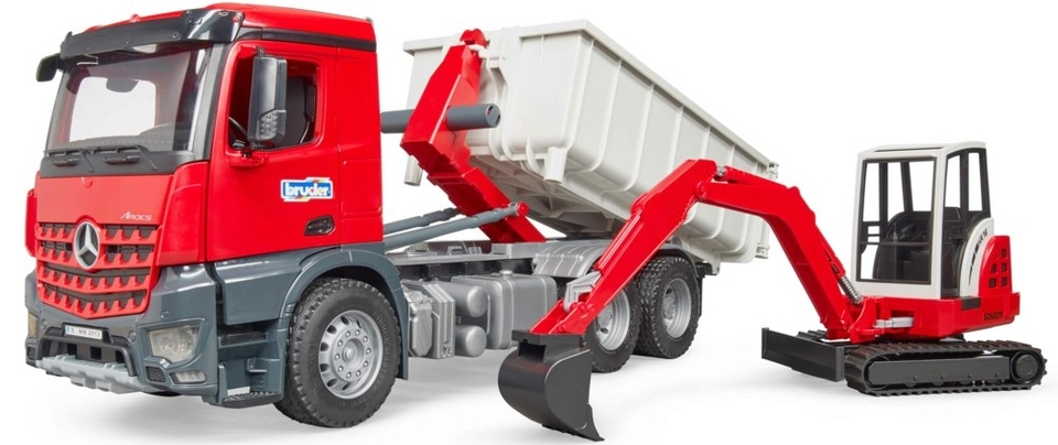 Bruder φορτηγό Mercedes MB Arocs με ανατρεπόμενη καρότσα και mini εκσκαφέα Μήκος φορτηγού:50 εκ Μήκος εκσκαφέα:27 εκ