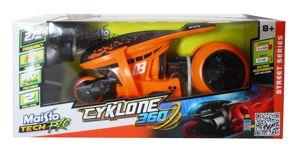 Maisto Cyclone 360 R/C τηλεκατευθυνόμενη μηχανή από την Maisto. • Φουτουριστικό στυλ βγαλμένο από το μέλλον. • Καταπληκτική ενέργεια. • Οι πίσω τροχοί στρέφονται και περιστρέφονται 360 μοίρες. • Φωτεινά χρώματα Led αλλάζουν με την οδήγηση. Απαιτούνται 4 x AA και 2 x ΑΑΑ.