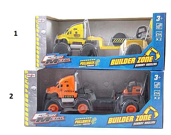 Maisto Fresh Metal Builder Zone Quarry Hauler. Όταν η κατάσταση δυσκολεύει είναι ώρα για το Quarry Hauler! Ενισχυμένο όχημα κατασκευής, ικανό να μεταφέρει βαριά αντικείμενα! Τροχοφόρο ημιφορτηγό με πλαστικά εξαρτήματα! Το όχημα διαθέτει αφαιρούμενα ρυμουλκούμενα μέρη! Συμπεριλαμβάνει δεύτερο αυτοκινητάκι μικρότερου μεγέθους με πλαστικά εξαρτήματα!