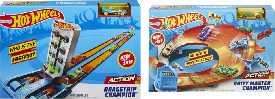 Hot Wheels αγωνιστικές πίστες Στο σετ Πίστας Drift Master Champion τεστάρετε την ακρίβειά σας. Για πρώτη φορά, τα παιδιά μπορούν να εκτοξεύσουν τα αυτοκινητάκια τους πλαγίως αντί να κατευθύνονται προς τα δεξιά και να κάνουν ντριφτ. Ρίξτε τις σημαίες για επιπλέον βαθμούς! Στο σετ Dragstrip Champion, με την απίθανη πύλη…