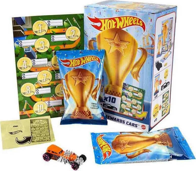 Hot Wheels Αυτοκινητάκια Rewards Cars – Σετ Των 10 Hot Wheels Αυτοκινητάκια Rewards Cars – Σετ Των 10. Κάθε πακέτο περιλαμβάνει 10 διαφορετικά οχήματα Hot Wheels κλίμακας 1:64, το καθένα τυλιγμένο στο σακουλάκι του και συνοδεύεται από ένα χρυσό αυτοκόλλητο. Τα Hot Wheels Rewards Car Packs γιορτάζουν την καλή συμπεριφορά…
