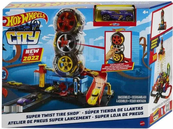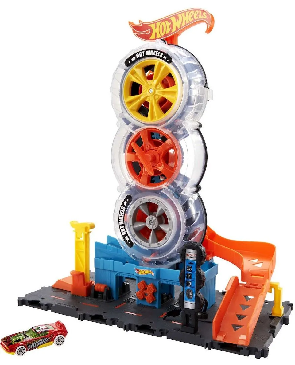 Hot Wheels Πίστα City Με Περιστρεφόμενες Ρόδες α παιδιά αντιμετωπίζουν πολλαπλές ανατροπές στο Hot Wheels City Super Twist Tire Shop καθώς περιστρέφουν το κεντρικό κλειδί και μετακινούν τα αυτοκίνητά τους μέσα από τους ημιδιαφανείς τροχούς του γκαραζ. Μόλις φτάσουν στην κορυφή, κάνουν ακροβατικά στη ράμπα, σε νέες περιπέτειες. Η βάση…