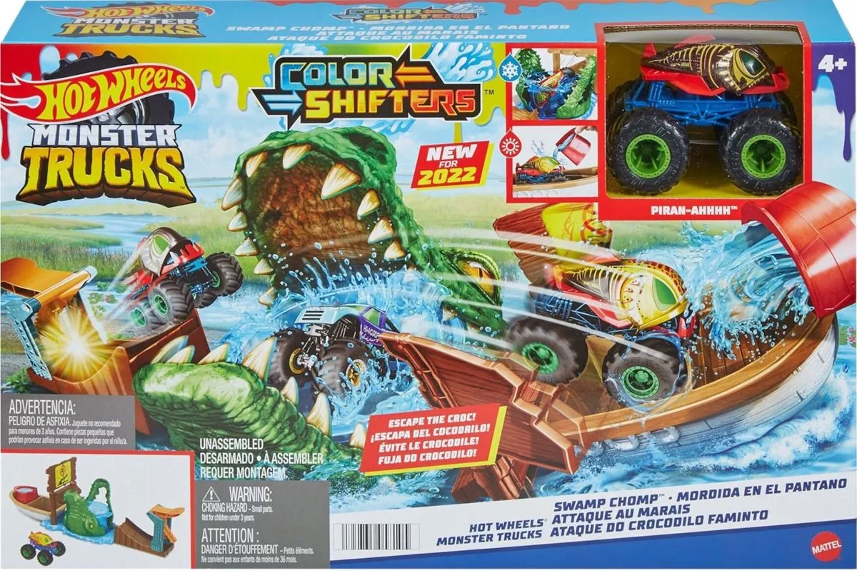 Hot Wheels Σετ Παιχνιδιού Χρωμοκεραυνών Με Κροκόδειλο Με το σετ παιχνιδιών Hot Wheels Monster Trucks Swamp Chomp Color Shifters, το χτύπημα και η συντριβή προσφέρουν ένα κύμα εκπλήξεων αλλαγής χρώματος για τεράστιες συγκινήσεις και ενθουσιασμό! Εκκινήστε το συμπεριλαμβανόμενο Color Shifters Piran-ahhh και όταν πέσει στο στόμιο του gator γεμάτο παγωμένο…