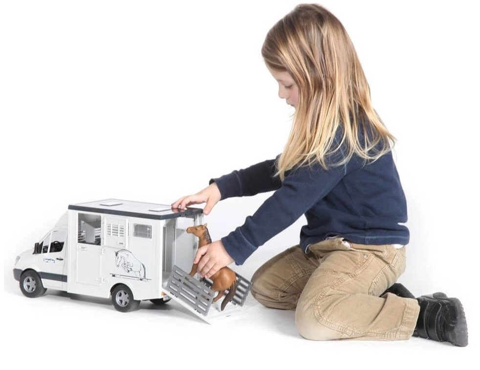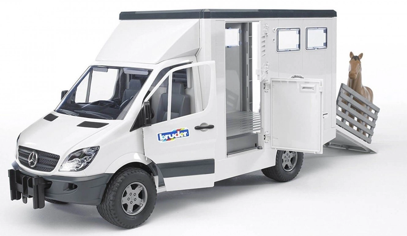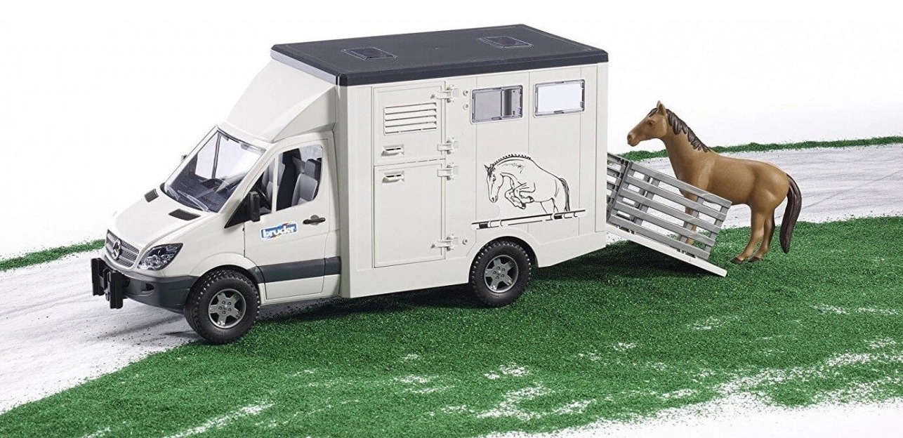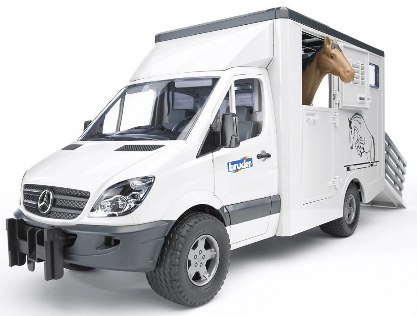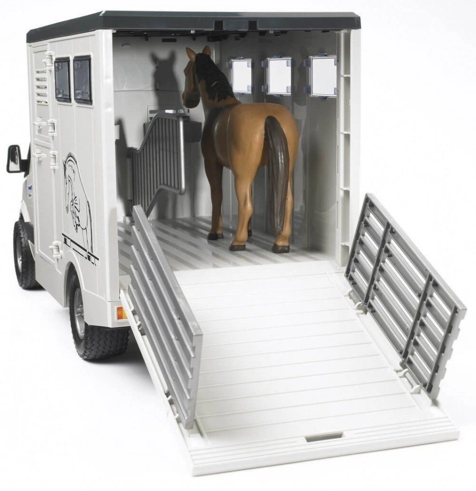 Mercedes Sprinter μεταφοράς αλόγων Bruder MB animal transporter. Μεταφοράς αλόγων και παραθυράκι στο πλα’ι’ που ανοίγει. -Οι πόρτες μπορούν να ανοίξουν. – Πτυσσόμενη σκάλα – Λάστιχα πέλματος – 1 άλογο (σε 3 χρώματα) Διαστάσεις: 45,5x17x22 εκ. (μήκος/ύψος/πλάτος)